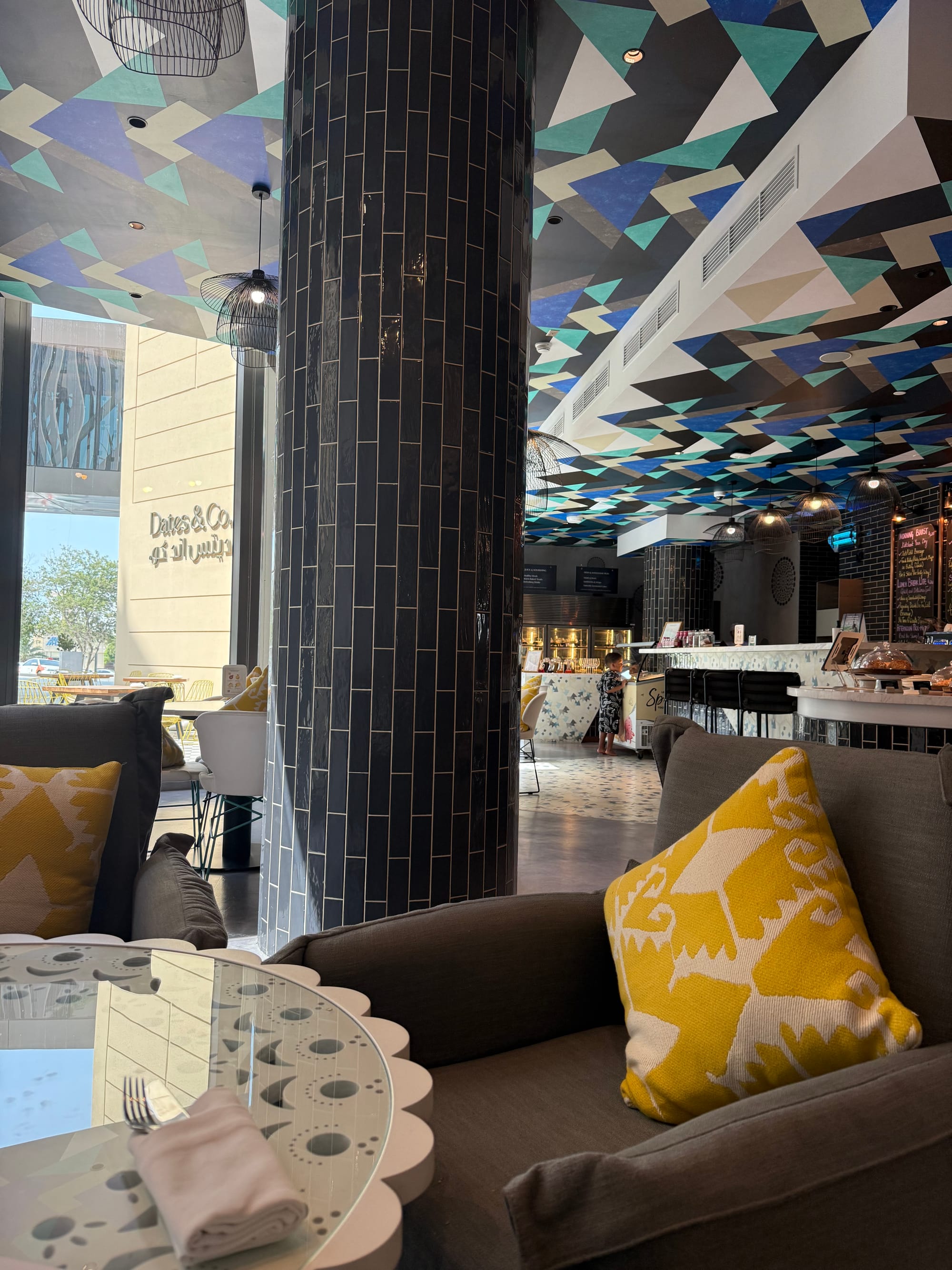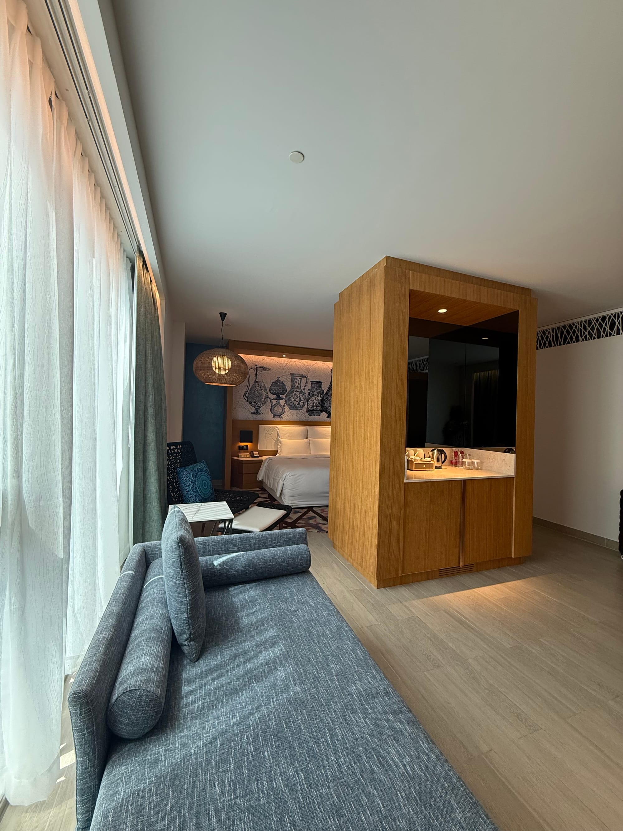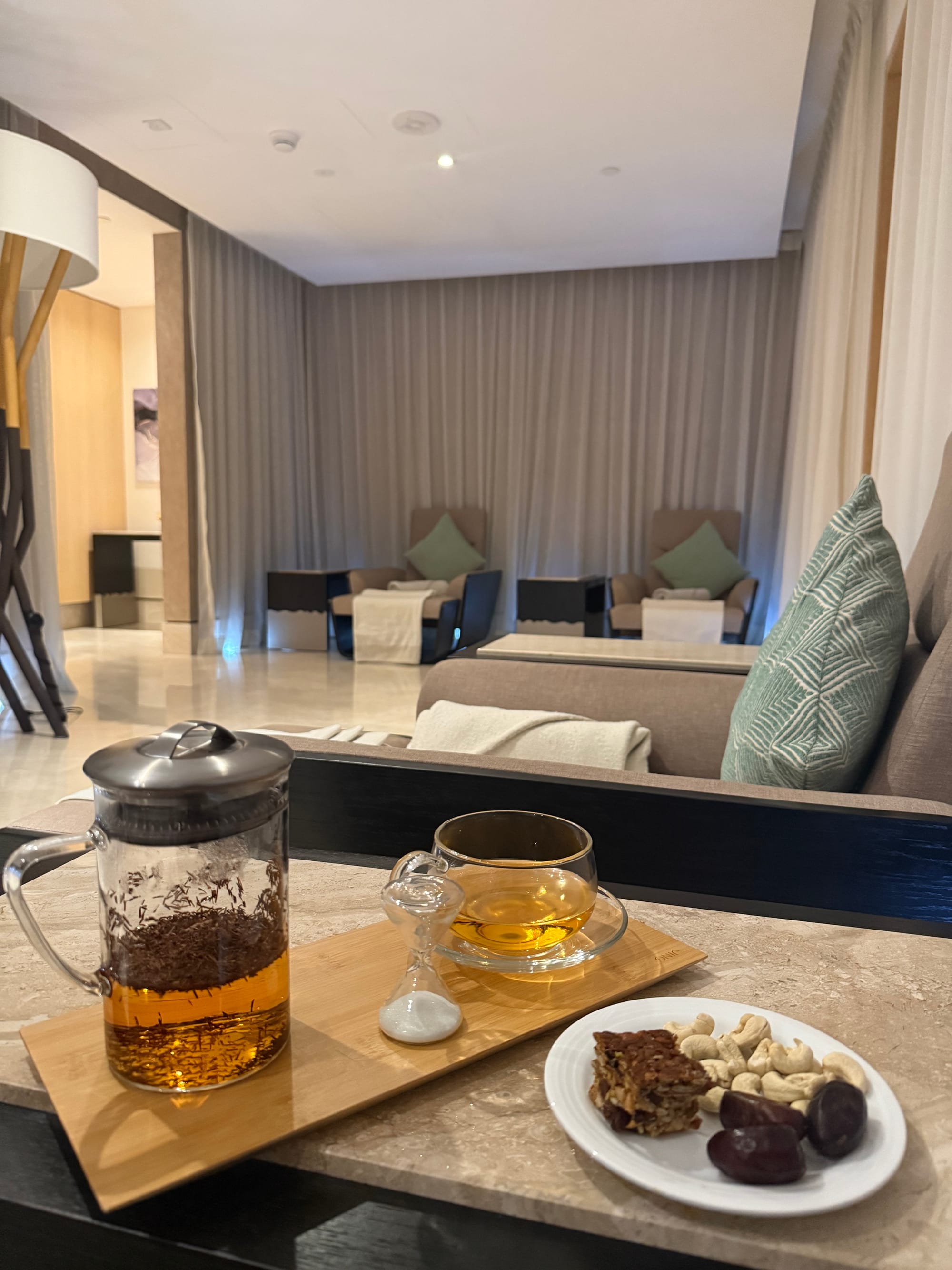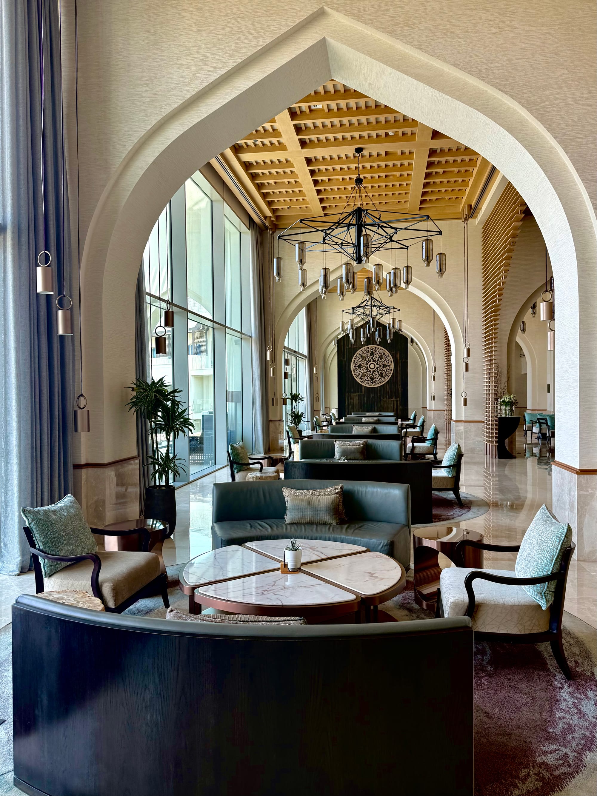 Perché entre falaises dorées et mer azur, le Jumeirah Muscat Bay est une adresse d’exception. Dès l’entrée, on est happés par le magnifique parfum d’encens Luban (ou Frankincense), emblématique d’Oman dans une réception suspendue au 5e étage, qui donne accès à un panorama à couper le souffle.